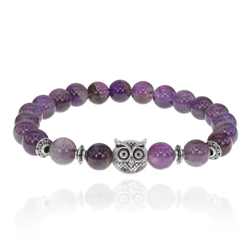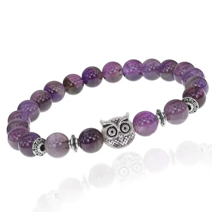 Браслет-амулет Сова с нат. камнем Аметист 8мм BSHE-03-03S