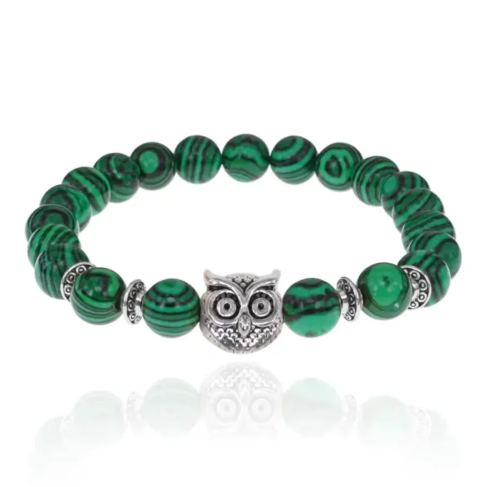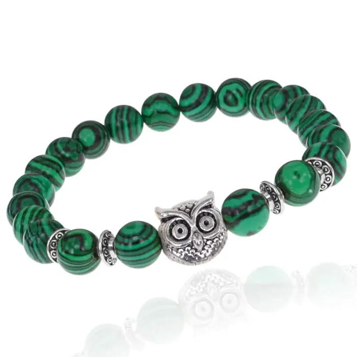 Стрейч-браслет с бусинами из бижутерного сплава и синтетического камня малахит, с изображением совы.
