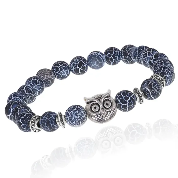 Браслет-амулет Сова с нат. камнем синий Африканский агат 8мм BSHE-03-27S