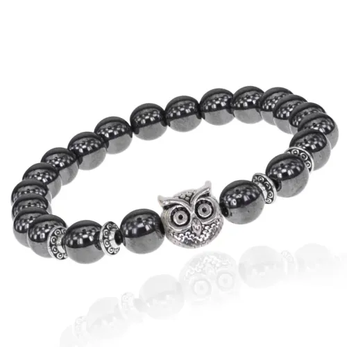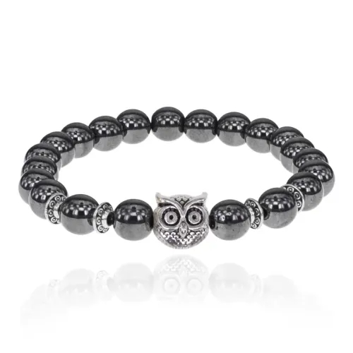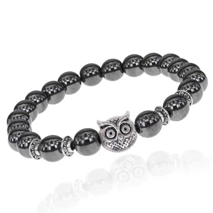 Стрейч-браслет с подвеской в виде совы и бусинами из синтетического гематита.