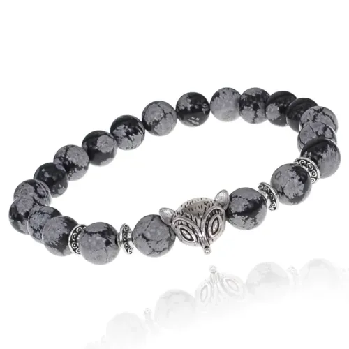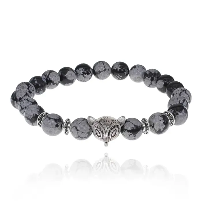 Браслет-амулет Лиса с нат. камнем Снежный обсидиан 8мм BSHE-04-14S