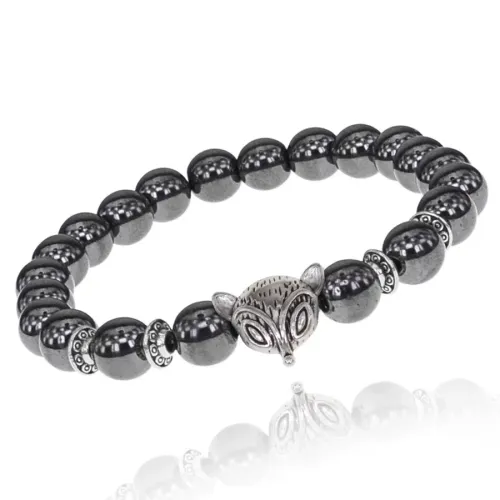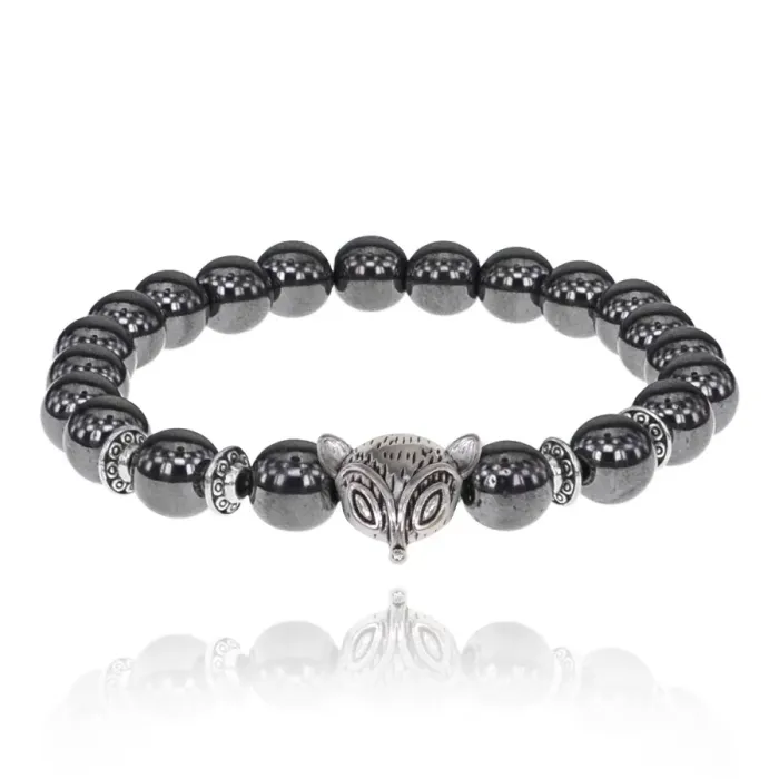Браслет-амулет Лиса с синт. камнем Гематит (не магнит.) 8мм BSHE-04-28S
