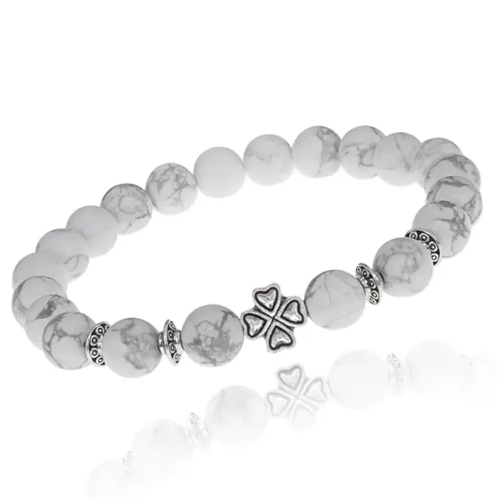 Стрейч-браслет с бусинами из натурального камня кахолонг и декоративным элементом в виде четырёхлистного клевера.
