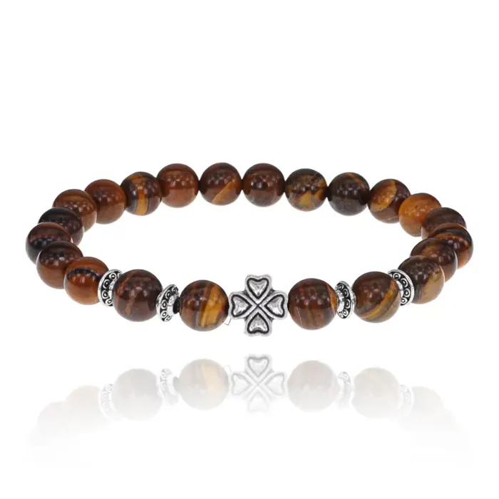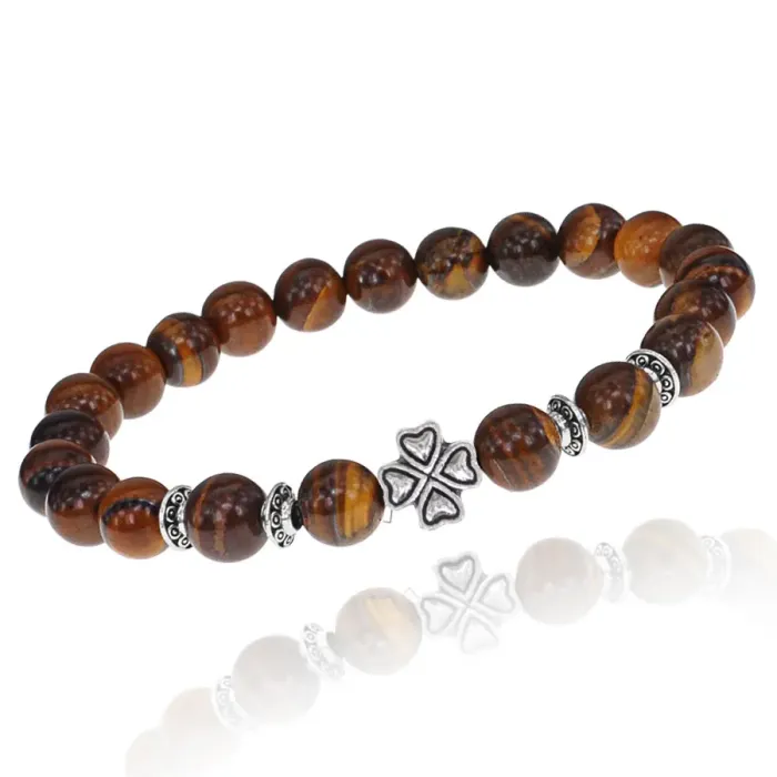 Стрейч-браслет с бусинами из камня тигровый глаз и декоративным элементом в виде клевера.