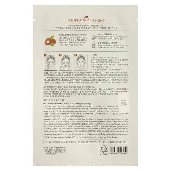 Маска на тканевой основе для лица с экстрактом масла ши Natural Shea Butter Mask Sheet от The Saem объёмом 21 мл разработана для мгновенного восстановления липидного баланса кожи и защиты её от пересыхания. Благодаря высокому содержанию витаминов, масло ши улучшает внешний вид проблемной кожи, разглаживает её поверхность и придаёт матовость. Маска эффективно увлажняет и питает кожу, борется с мелкими морщинками и защищает от неблагоприятных внешних факторов, таких как ветер, холод и УФ-лучи.