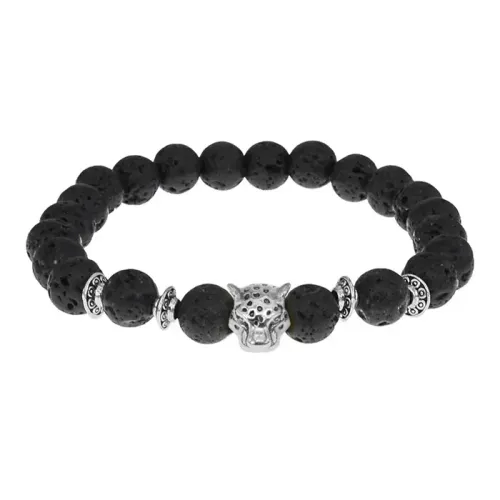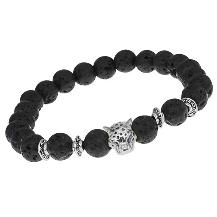 Стрейч-браслет-амулет с бусинами из камня лава и декоративным элементом в виде леопарда.