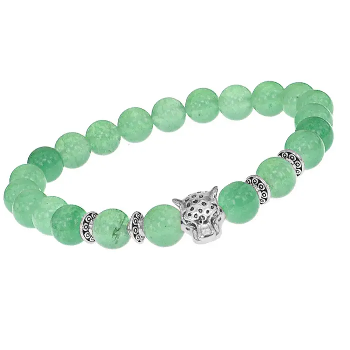 Стрейч-браслет с бусинами из бижутерного сплава и натурального нефрита. В дизайне использован амулет в форме леопарда.