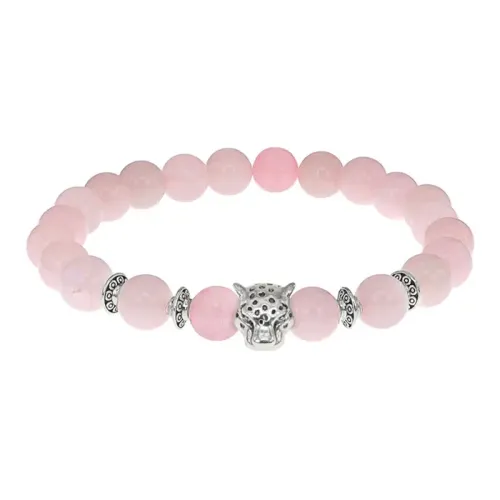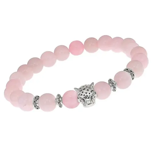 Стрейч-браслет с амулетом в виде леопарда и бусинами из розового кварца.
