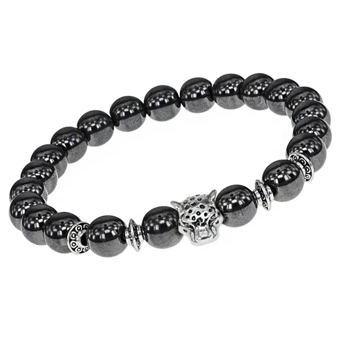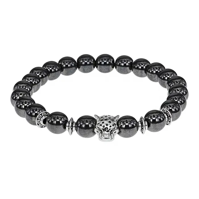 Браслет-амулет Леопард с синт. камнем Гематит (не магнит.) 8мм BSHE-07-28S