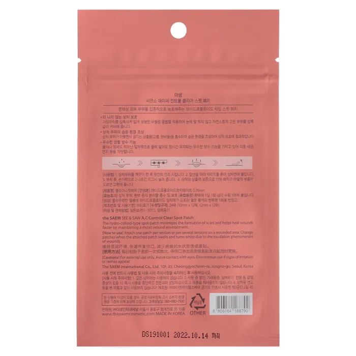Гидрогелевые патчи See & Saw A.C. Control Clear Spot Patch от The Saem предназначены для эффективной борьбы с прыщами, угрями и другими несовершенствами кожи. Эти патчи способствуют быстрому заживлению ранок и микротрещин, защищают кожу от воздействия болезнетворных бактерий и помогают вытянуть гной из слоёв эпидермиса. Основным действующим компонентом является вытяжка из эхинацеи, обладающая сильными антибактериальными свойствами, что способствует обеззараживанию ранок и их быстрому заживлению.