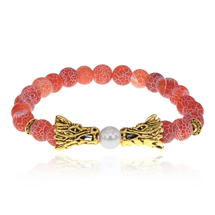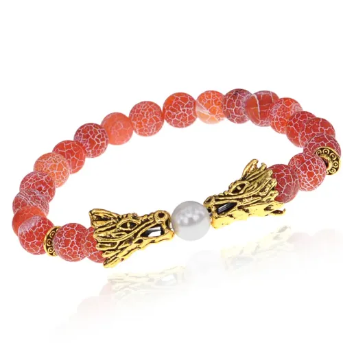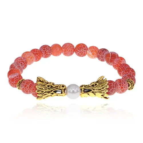 Стрейч-браслет с бусинами из натурального африканского агата и декоративными элементами в виде драконов.