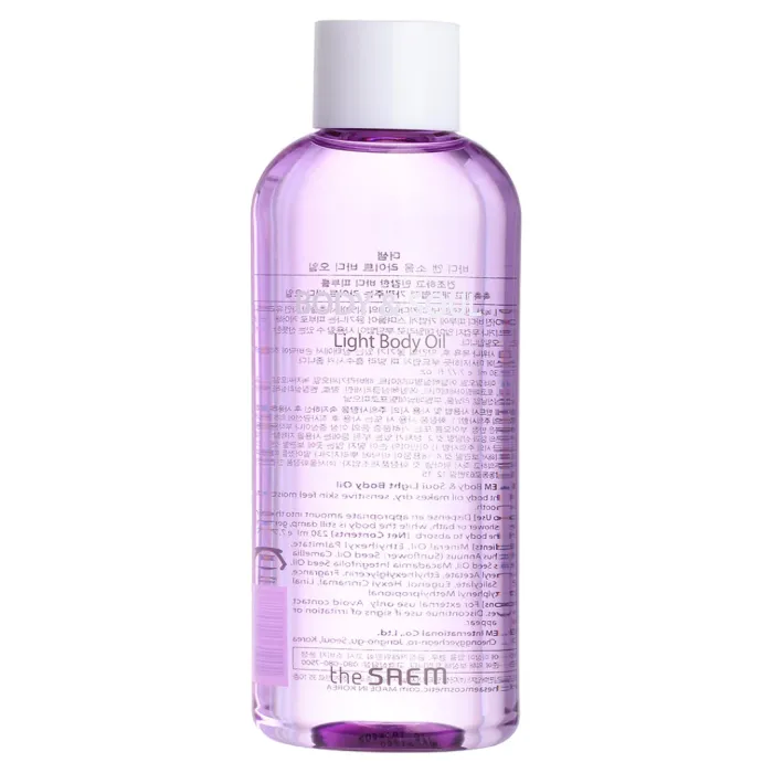 Лёгкое масло для тела от корейского бренда The Saem — это идеальное средство для ухода за кожей и борьбы с первыми признаками старения. Благодаря своей лёгкой текстуре и высокому содержанию натуральных компонентов, масло быстро впитывается, не оставляя жирного блеска. В составе масла — 100% натуральные компоненты: масла подсолнечника, семян камелии и макадамии, а также витамин E. Эти ингредиенты питают и смягчают кожу, устраняют шелушения и способствуют разглаживанию рельефа. Кожа становится гладкой, мягкой и бархатистой.
