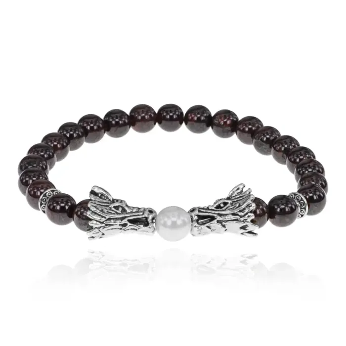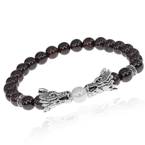 Стрейч-браслет с бусинами из натурального граната и декоративным элементом в виде дракона.