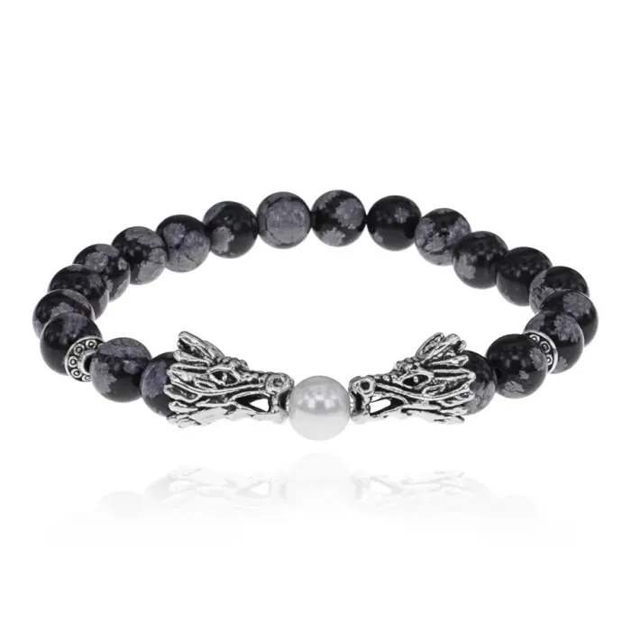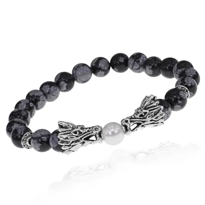 Браслет-амулет Драконы с нат. камнем Снежный обсидиан 8мм BSHE-08-14S