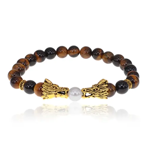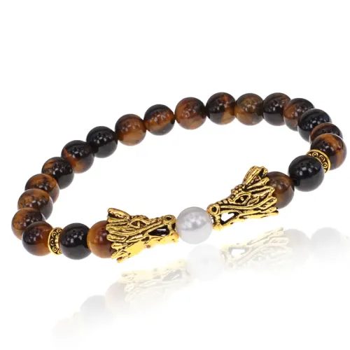 Стрейч-браслет с бусинами из камня тигровый глаз и декоративными элементами в виде драконов.