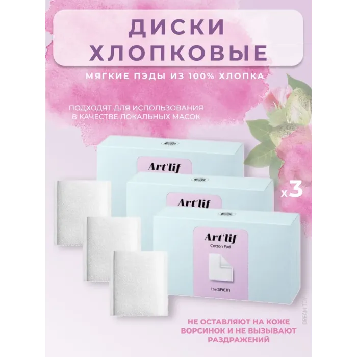 Набор очищающих хлопковых пэдов ArtLif Cotton Pad от The Saem предназначен для эффективного ухода за кожей лица и снятия макияжа. В комплекте 80 штук размером 57 мм х 47 мм, которые помогают удалять различные загрязнения с кожи. Пэды не оставляют ворсинок и не вызывают раздражений, что делает их подходящими для всех типов кожи.