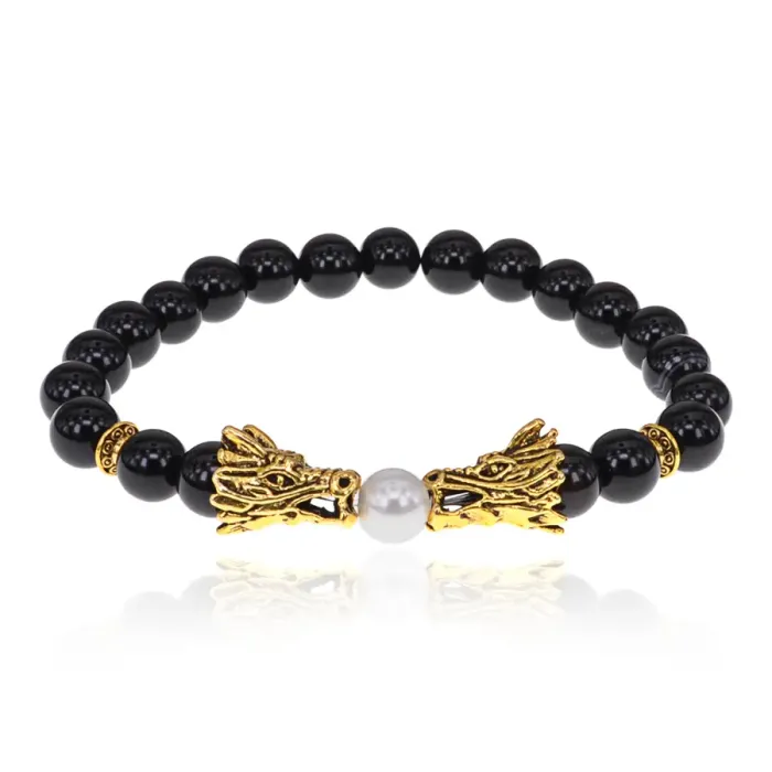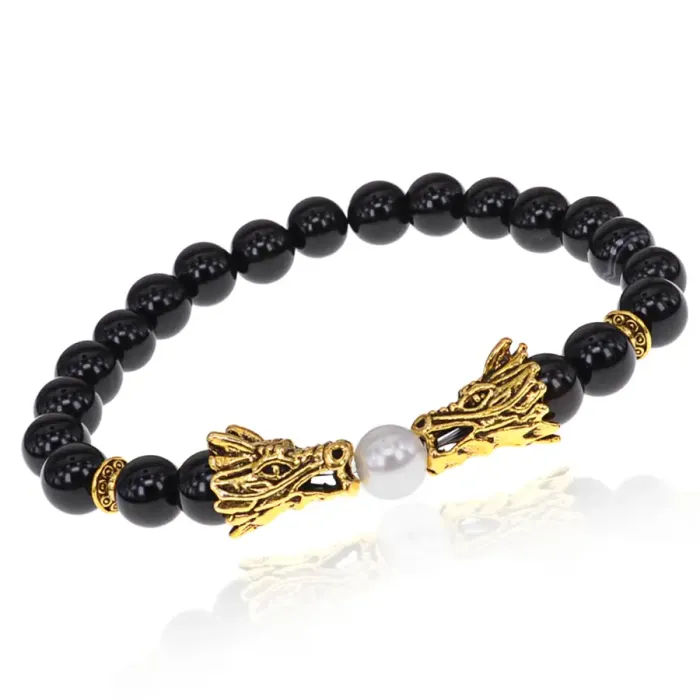 Стрейч-браслет-амулет с бусинами из черного агата и декоративными элементами в виде драконов.