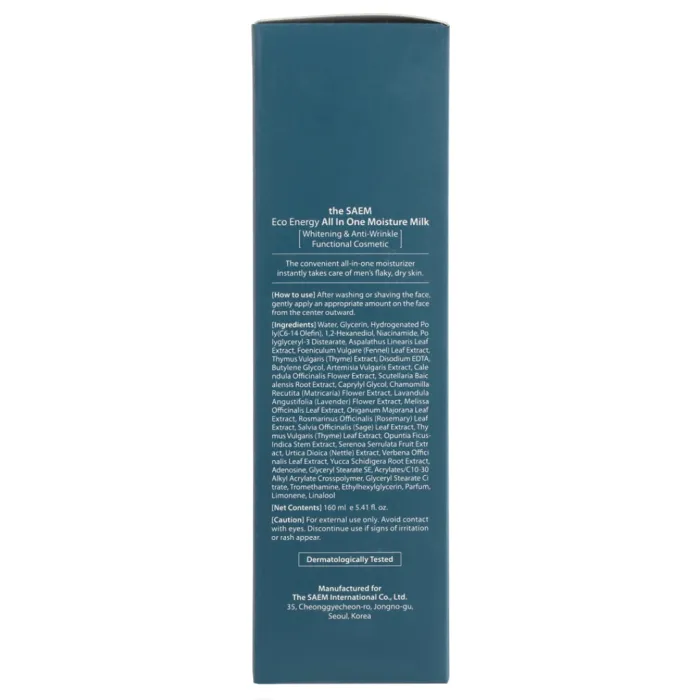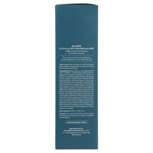 Увлажняющий лосьон Eco Energy All In One Moisture Milk от The Saem разработан для ухода за сухой и раздражённой кожей. Концентрированная формула продукта помогает поддерживать гидролипидный баланс кожи, предотвращая её сухость и шелушение. Лосьон повышает защитные функции и эластичность кожи, улучшает цвет лица, а также снимает воспаление и раздражение. Он защищает кожу от негативного воздействия солнца, ветра, мороза и частого бритья.