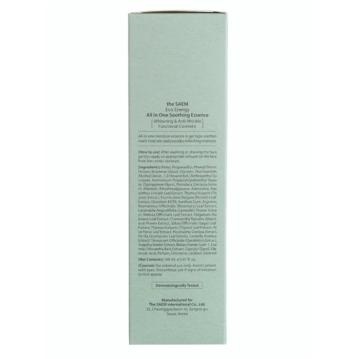 Увлажняющая эссенция для лица Eco Energy All In One Soothing Essence от The Saem — это многофункциональное средство, специально разработанное для мужчин. Оно эффективно увлажняет кожу, делая её мягкой и гладкой. Эссенция помогает устранить раздражения, нормализует работу сальных желёз и улучшает цвет лица. Средство наполняет клетки энергией и подходит для всех типов кожи.