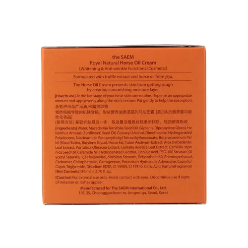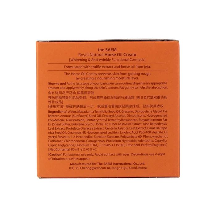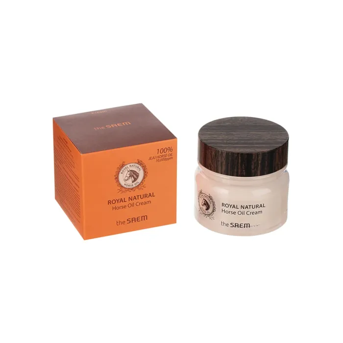Крем для лица Royal Natural Horse Oil Cream от The Saem разработан для интенсивного увлажнения и питания кожи. Основным компонентом средства является натуральный лошадиный жир, который благодаря своей высокой структурной совместимости с клетками кожи эффективно питает и восстанавливает её. Продукт мгновенно насыщает кожу влагой, витаминами и жирными кислотами, что способствует восстановлению липидного слоя на поверхности клеток.