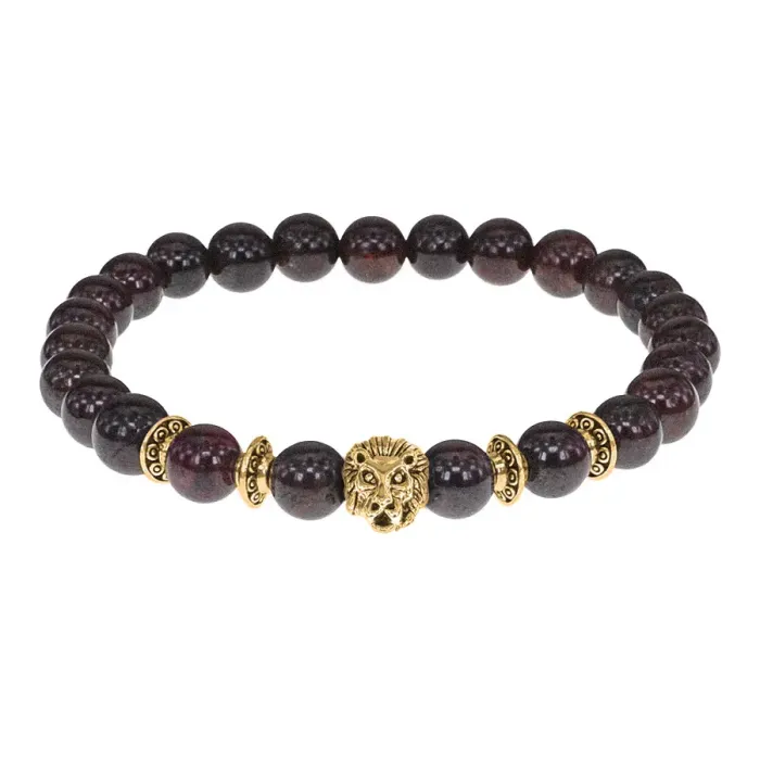 Стрейч-браслет с амулетом в виде льва и натуральным камнем гранат.