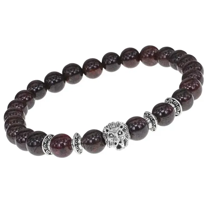 Стрейч-браслет с амулетом в виде льва и бусинами из натурального граната.