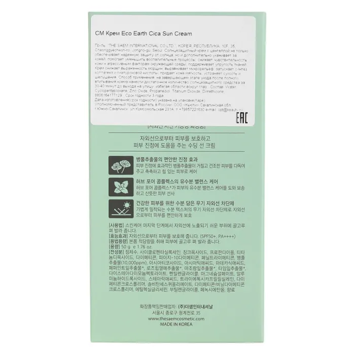 Солнцезащитный крем Eco Earth Cica Sun Cream 50 мл The Saem