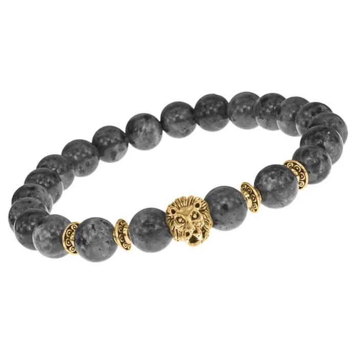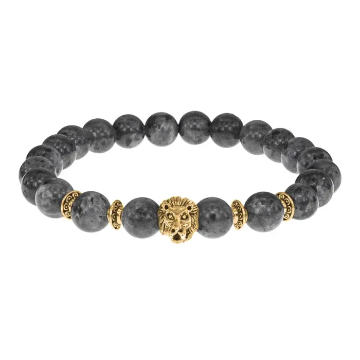 Стрейч-браслет с амулетом в виде льва и бусинами из натурального камня лабрадор.