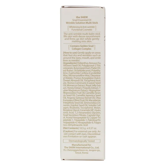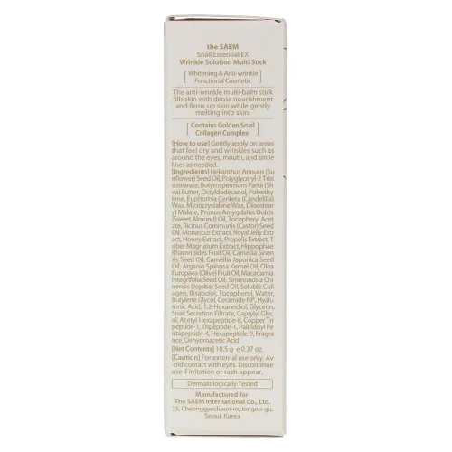 Стик-бальзам для кожи лица Snail Essential EX Wrinkle Solution Multi Stick от The Saem — это эффективное средство для ухода за кожей, разработанное для борьбы с признаками старения. Продукт легко наносится и быстро впитывается, насыщая кожу питательными веществами. Бальзам содержит уникальный комплекс ингредиентов, которые способствуют улучшению состояния кожи.