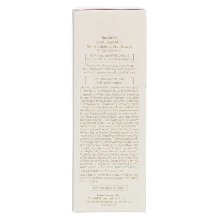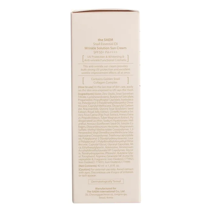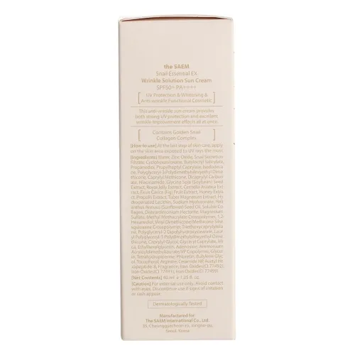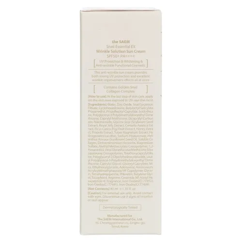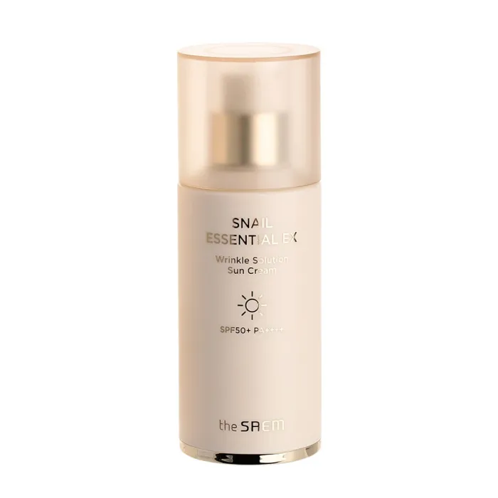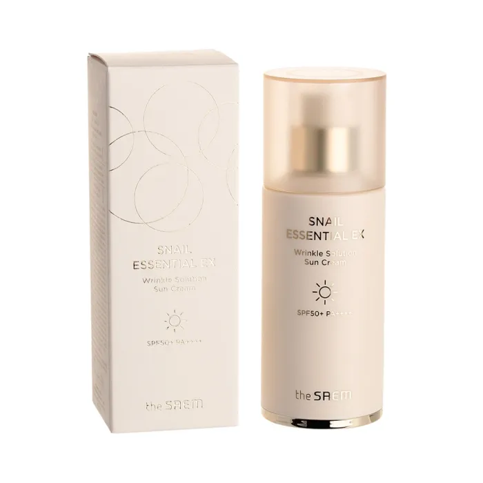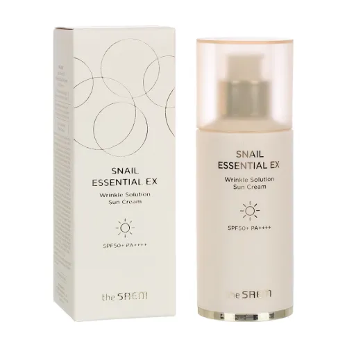 Солнцезащитный крем для лица Snail Essential EX Wrinkle Solution Sun Cream от The Saem обеспечивает надежную защиту кожи от ультрафиолетовых лучей благодаря высокому солнцезащитному фактору SPF 50+ PA++++. Этот крем не только защищает кожу, но и ухаживает за ней благодаря экстракту улитки, который способствует восстановлению и улучшению состояния кожи. Продукт гипоаллергенен и подходит для чувствительной кожи.