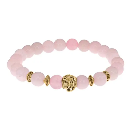 Стрейч-браслет с амулетом в виде льва и бусинами из натурального розового кварца.