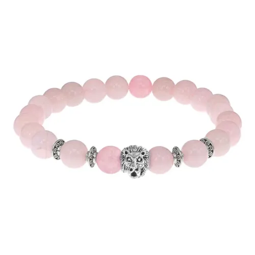 Стрейч-браслет с амулетом в виде льва и бусинами из натурального розового кварца.
