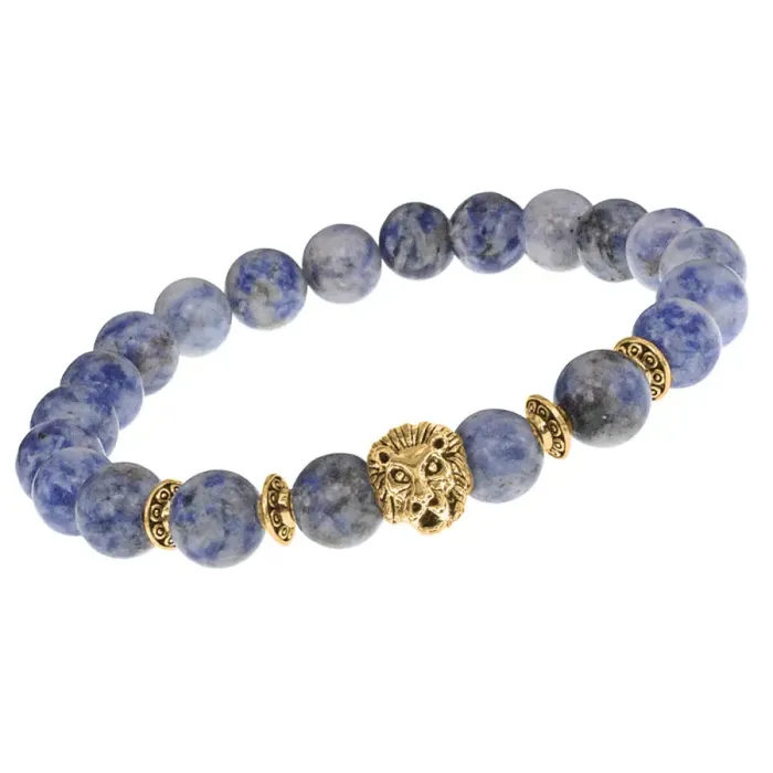 Стрейч-браслет с амулетом в виде льва и бусинами из натурального камня содалит.