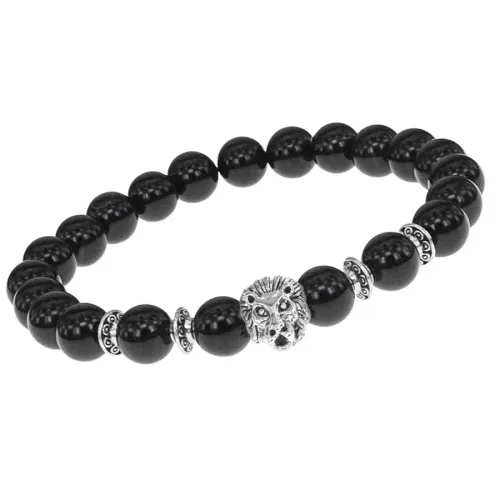 Браслет-амулет Лев с нат. камнем Черный агат 8мм BSHE-09-23S