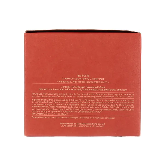 Пады Urban Eco Golden Berry C Toner Pack от The Saem — это эффективное средство для борьбы с морщинами и пигментацией. Они содержат 80% экстракта золотой перуанской ягоды (физалиса), который известен своими осветляющими и омолаживающими свойствами. Тонкие пады, пропитанные тонером, обеспечивают эффективное проникновение активных ингредиентов в кожу. Средний слой тройной структуры содержит большое количество эссенции для максимальной эффективности. Внешняя поверхность падов изготовлена из вискозной ткани, которая уменьшает раздражение кожи.