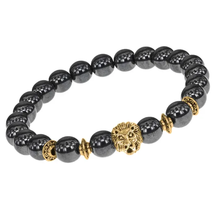 Браслет-амулет Лев с синт. камнем Гематит 8мм BSHE-09-28G