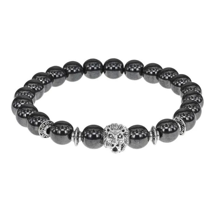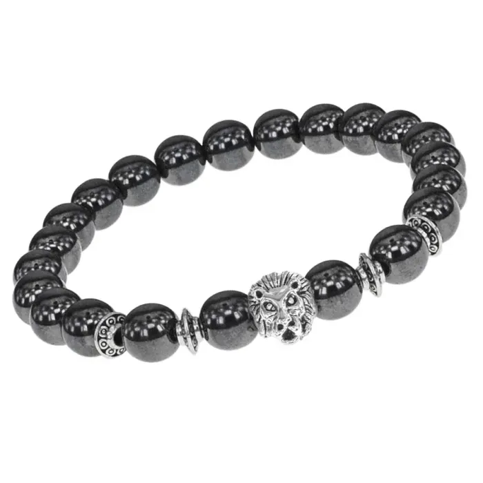 Браслет-амулет Лев с синт. камнем Гематит (не магнит.) 8мм BSHE-09-28S