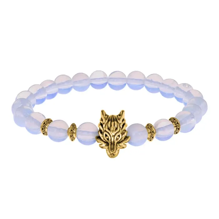 Бижутерный стрейч-браслет с амулетом в виде волка и бусинами из синтетического лунного камня.