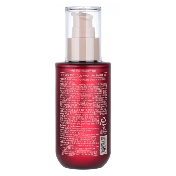 Масло Silk Hair Repair Oil от The Saem обеспечивает интенсивный уход за пересушенными и повреждёнными волосами. Оно восстанавливает структуру волос, пострадавших от окрашивания, использования фена и термических инструментов для укладки. Продукт создаёт защитное покрытие благодаря белковому комплексу и содержит натуральные масла и экстракты.