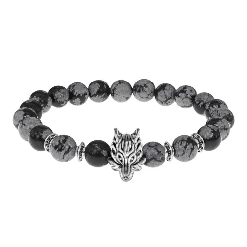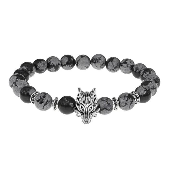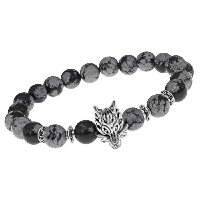 Браслет-амулет Волк с нат. камнем Снежный обсидиан 8мм BSHE-10-14S
