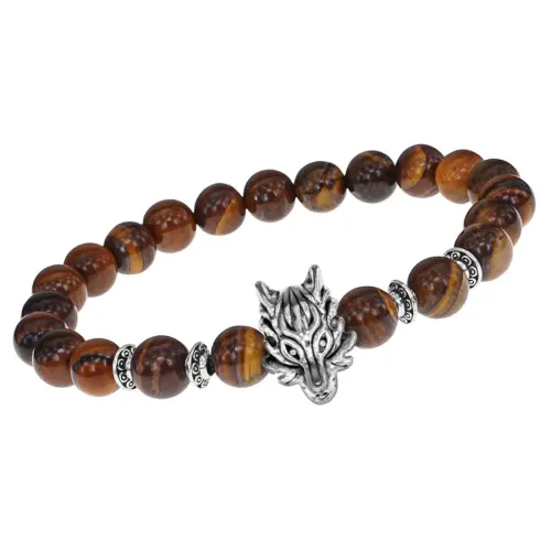 Стрейч-браслет с амулетом в виде волка и бусинами из тигрового глаза.