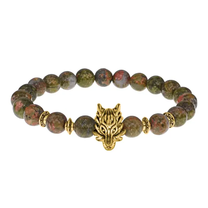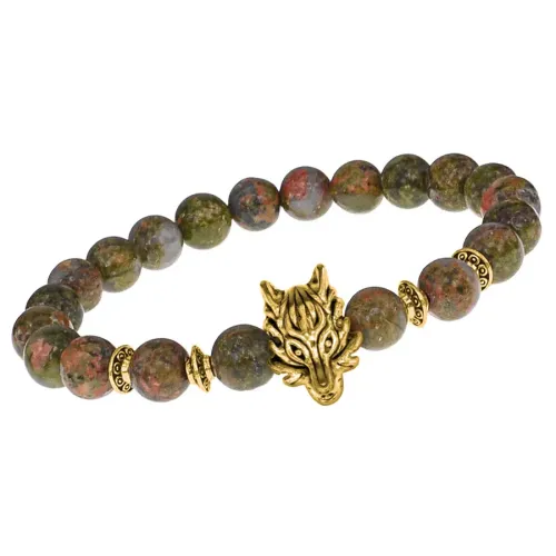Браслет-амулет Волк с нат. камнем Унакит 8мм BSHE-10-20G