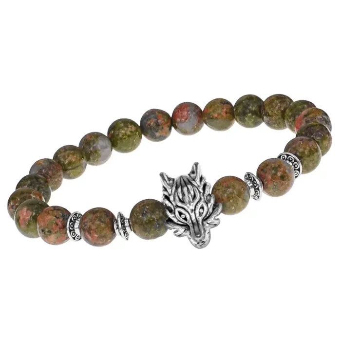Браслет-амулет Волк с нат. камнем Унакит 8мм BSHE-10-20S