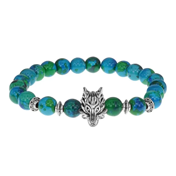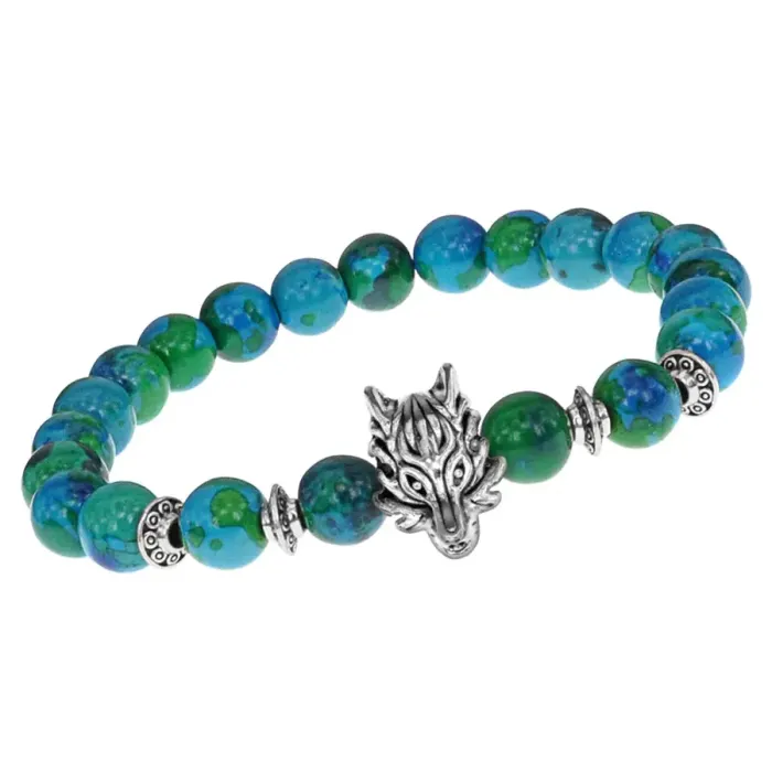 Браслет-амулет Волк с синт. камнем Хризоколла 8мм BSHE-10-21S