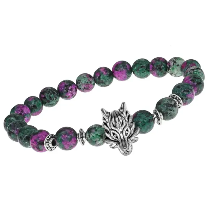 Браслет-амулет Волк с синт. камнем Цоизит 8мм BSHE-10-22S