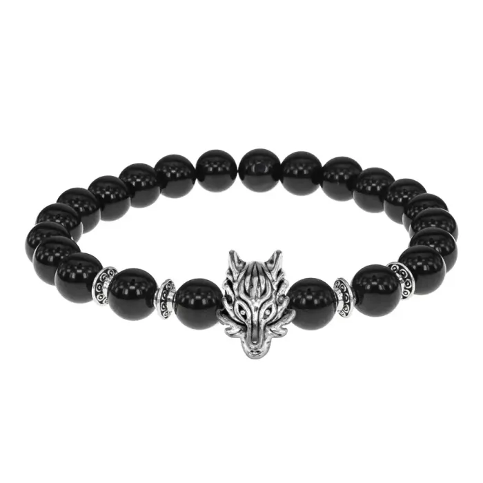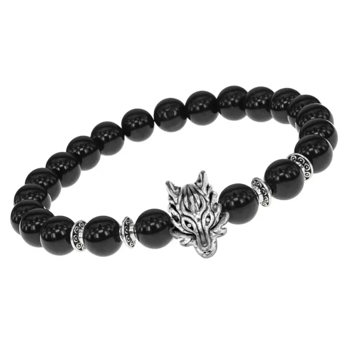 Стрейч-браслет с амулетом в виде волка и бусинами из чёрного агата.