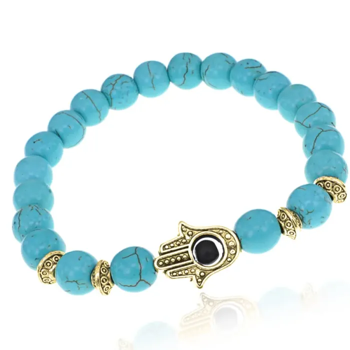 Браслет-амулет Хамса с синт. камнем Бирюза 8мм BSHE-G-05