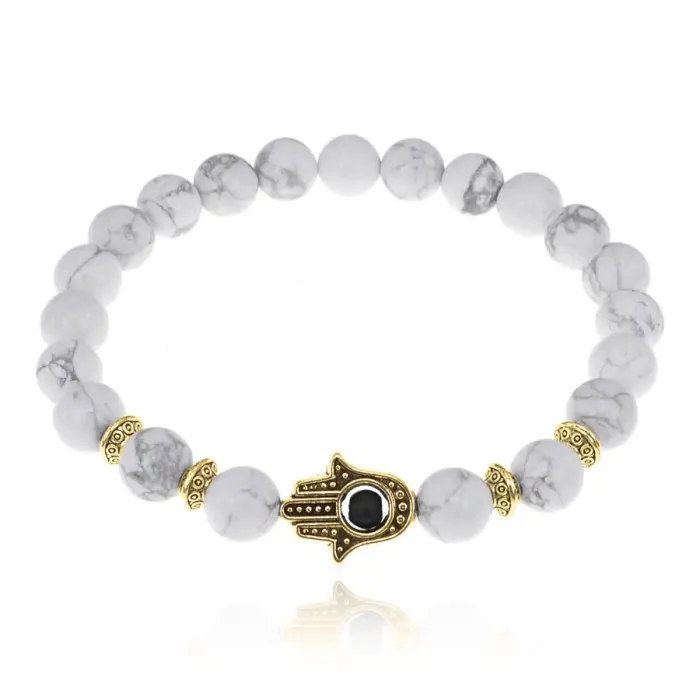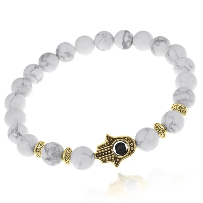 Стрейч-браслет с подвеской в виде амулета Хамса. Бусины выполнены из камня кахолонг, подвеска — из бижутерного сплава с покрытием под золото.