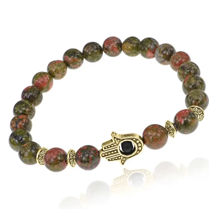 Браслет-амулет Хамса с нат. камнем Унакит 8мм BSHE-G-20
