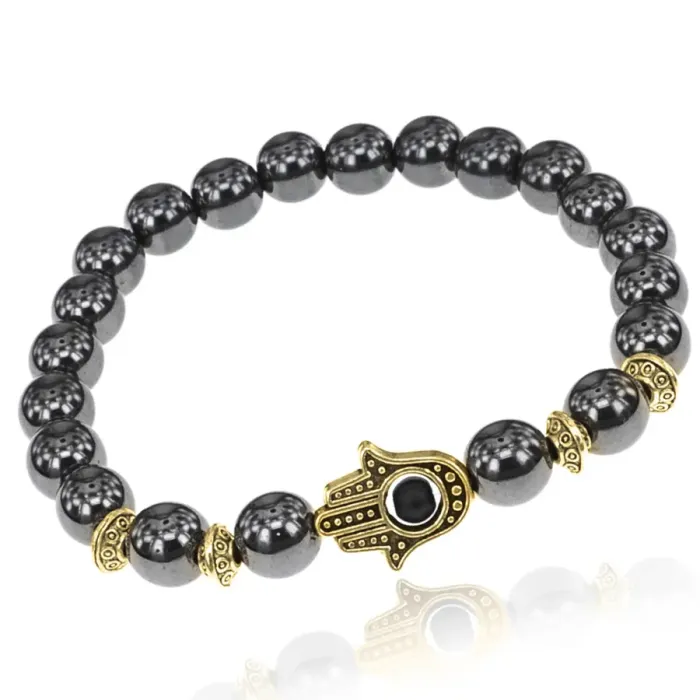 Браслет-амулет Хамса с синт. камнем Гематит (не магнит.) 8мм BSHE-G-28